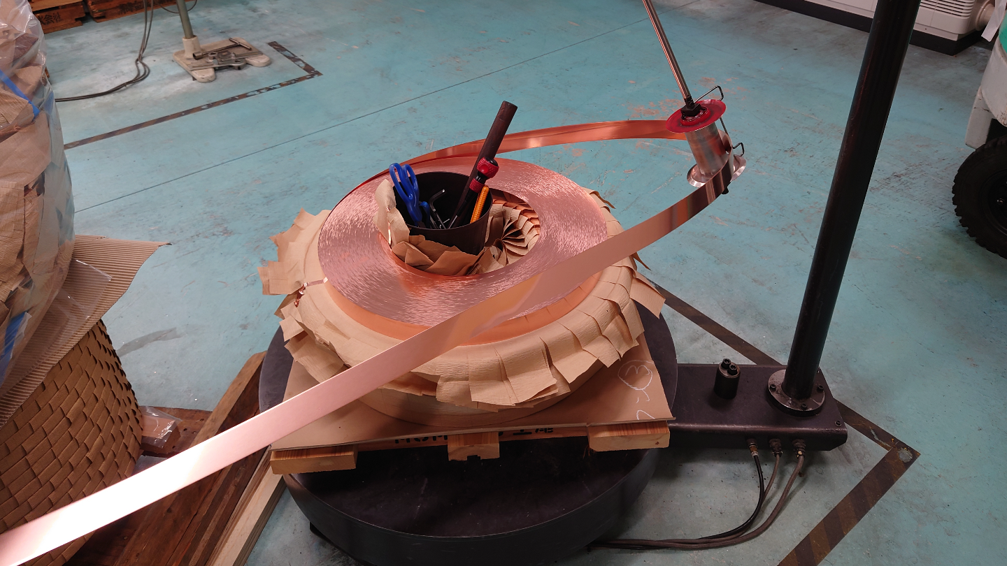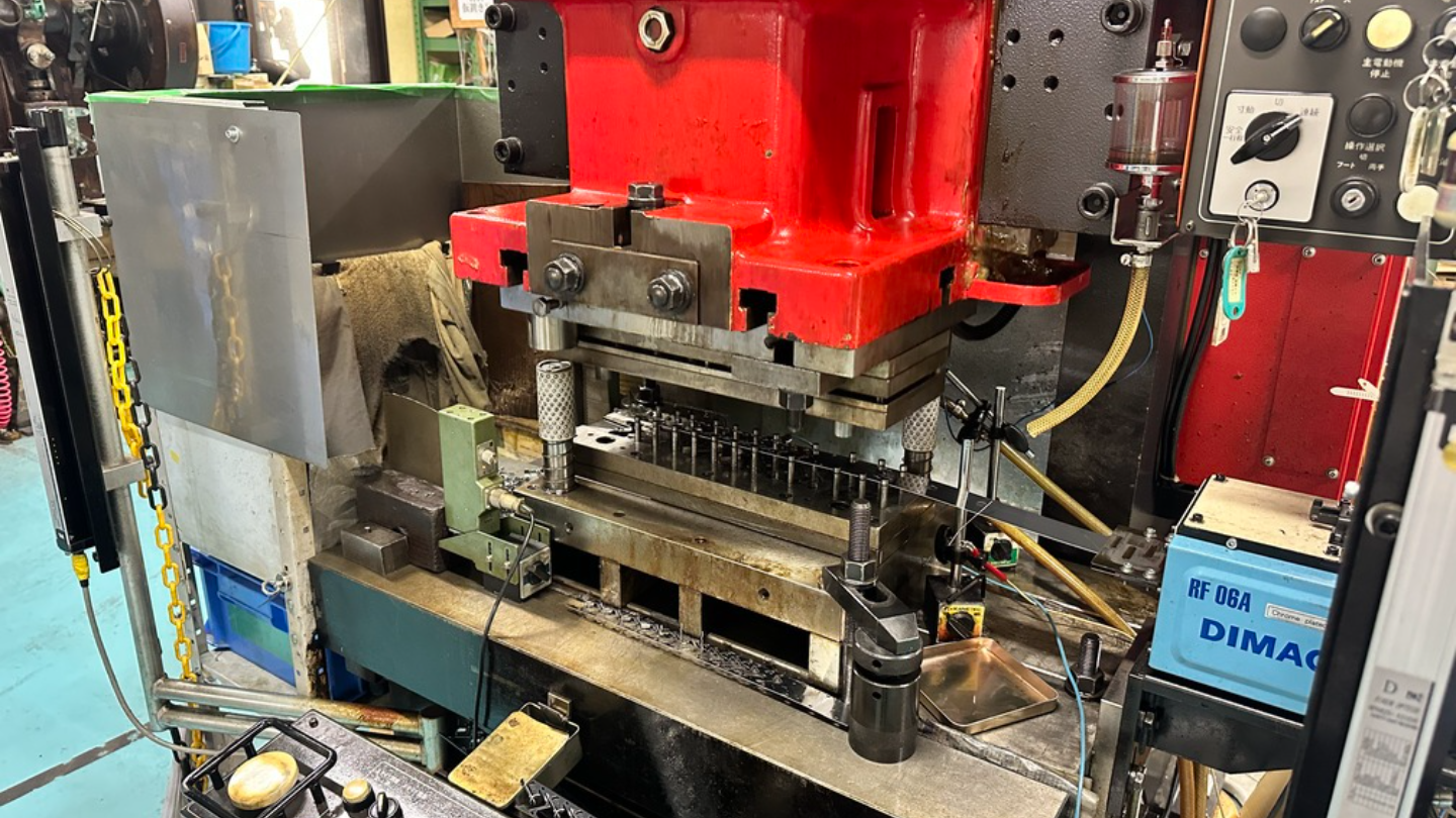 1.端子の材料となる銅材、ステンレスなど材をプレス機に設置します。